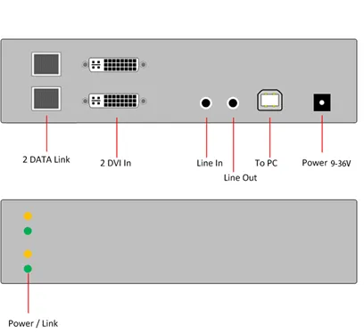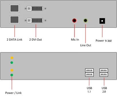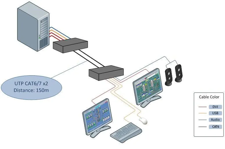 Передатчик конвертирует входящие сигналы видео, аудио и USB) и напрямую передает их по витой паре, а на другой стороне приемник напрямую принимает сигнал и преобразует его в видео на монитор, аудио (вход / выход) и USB. Это идеальное решение для организации удаленных двухмониторных рабочих мест, оснащенных DVI мониторами с USB периферией и аудио устройствами.