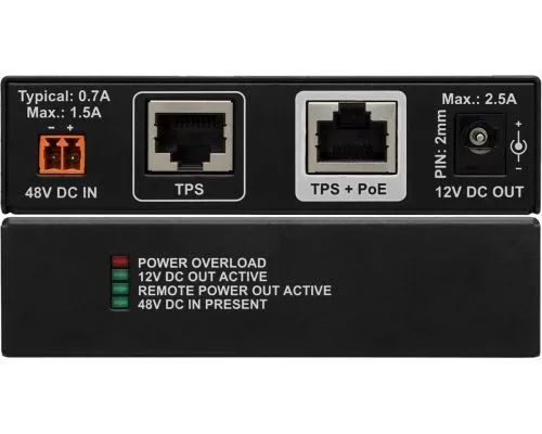 TPS-PI-1P1 является IEEE802.3at совместимым High End устройством, инжектором дистанционного питания, обеспечивает питанием удаленный TPS передатчик или приемник. * TPS-PI-1P1 может питать TPS удлинитель, помещенный в цепь передачи TPS, в любое место - между передатчиком и приемником. Входящие данные остаются нетронутыми, качество сигнала не изменяется, добавляется 48В к сигналу от этого устройства. Это устройство обеспечивает только однонаправленное дистанционное питание, но благодаря опции местного выхода 12V другое устройство может питаться с TPS-PI-1П1, если они расположены близко друг к другу. Питание самого инжектора обеспечивается его собственным адаптером питания, который идет в комплекте. TPS-PI-1P1 имеет 4 светодиодных индикатора на передней панели для мониторинга работы и устранения неисправностей: перегрузка питания, активность 12В постоянного тока, состояние дистанционного питания 48В в настоящее время.